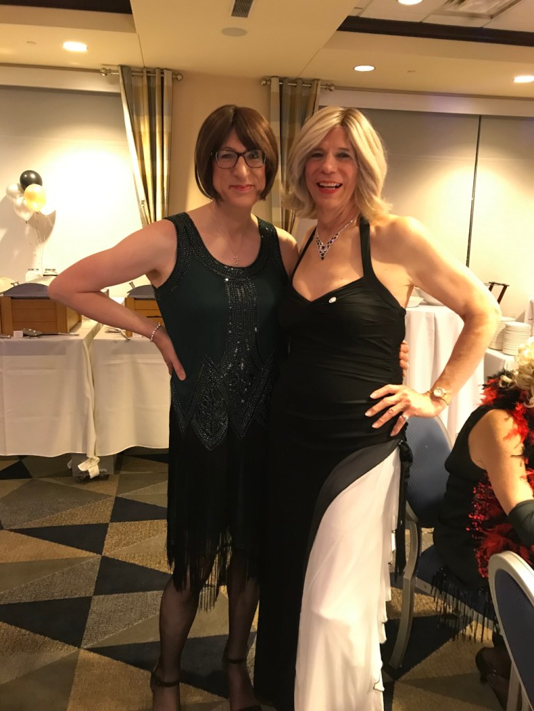 The following Wednesday I took the Greyhound bus from Pittsburgh to Lake Erie to attend the Lake Erie Gala, which is held there every year. This proved to be a fabulous occasion. The event was small, being based in a single hotel on the shore of Lake Erie, but the size of the Gala made it an intimate occasion that provided plenty of opportunities to meet new people and to make friends. I found the American t-girls in Lake Erie to be wonderfully warm and welcoming, and I am extremely grateful to them for the way that they welcomed an English visitor in their midst. It was good to be reminded how similar so many of our experiences are as t-girls, even though we might be separated by thousands of miles. It was also lovely to meet face-to-face a few people who I had only known previously through the medium of the internet, like the very lovely Christy Avery, pictured with me below at the 20s-themed Gala Dinner on the last evening.