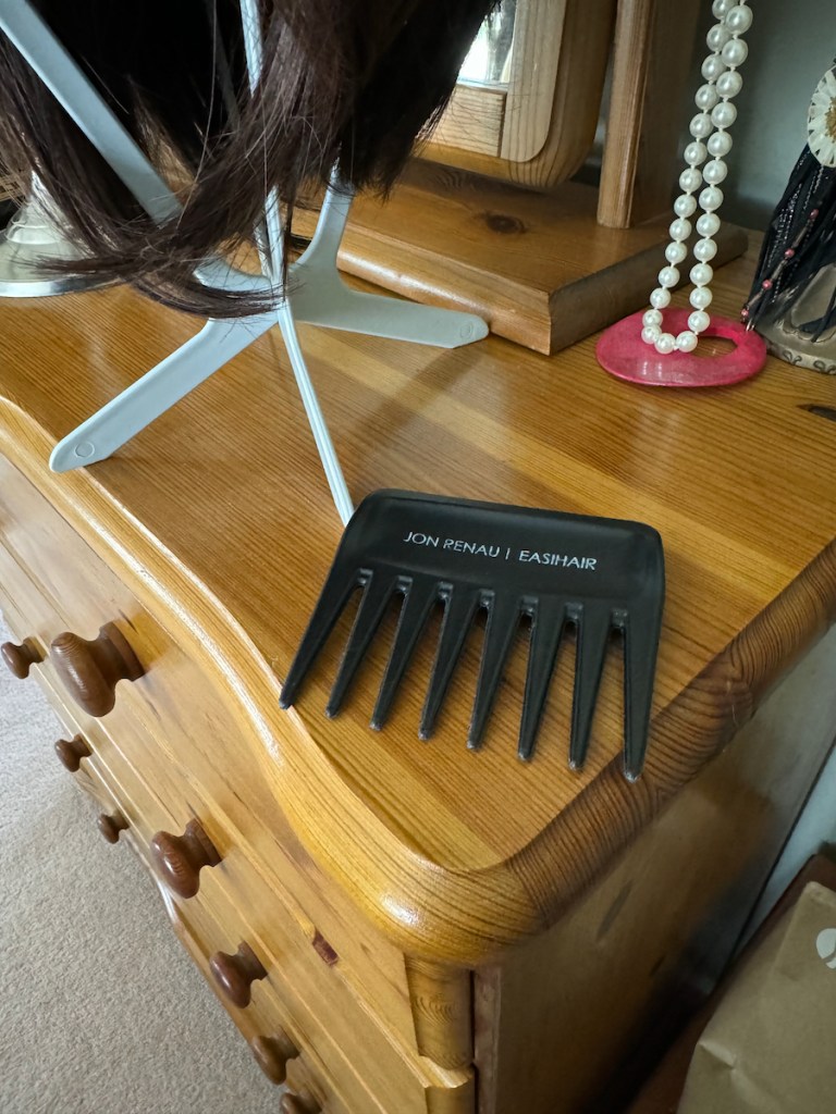 I wondered whether the wig was not sufficiently well made – it is a lightweight style, with fine fibres, and I wondered whether perhaps the knots were less secure too. However, being constrained by the need for a larger size wig, and the available colours and styles, I bought another 15 months ago, and vowed to spend some time looking into wig care in the hope of slowing the rate of shedding second time around. After some research, I came upon this wonderful comb by John Renau. It has broad teeth, unlike the stiff wires of my brush. Knots in synthetic hair are a bit weird – they tend to come apart quite easily if you work them gently with your fingers, but if you yank on them with a stiff brush, there is a tendency for the force to be transferred to the knot in the wig cap, starting the process by which it unties itself, or even to snap the fibre. However, the broad teeth of the John Renau comb mean that the natural tendency of the comb is to slip out of the hair when it meets resistance, rather than to get stuck and cause breakage. Of course, if you apply enough force, you’ll still cause damage. But the design of the comb works against this tendency. It hasn’t completely eliminated shedding for me, but it has reduced the rate markedly, with the consequence that I no longer worry about imminent baldness.